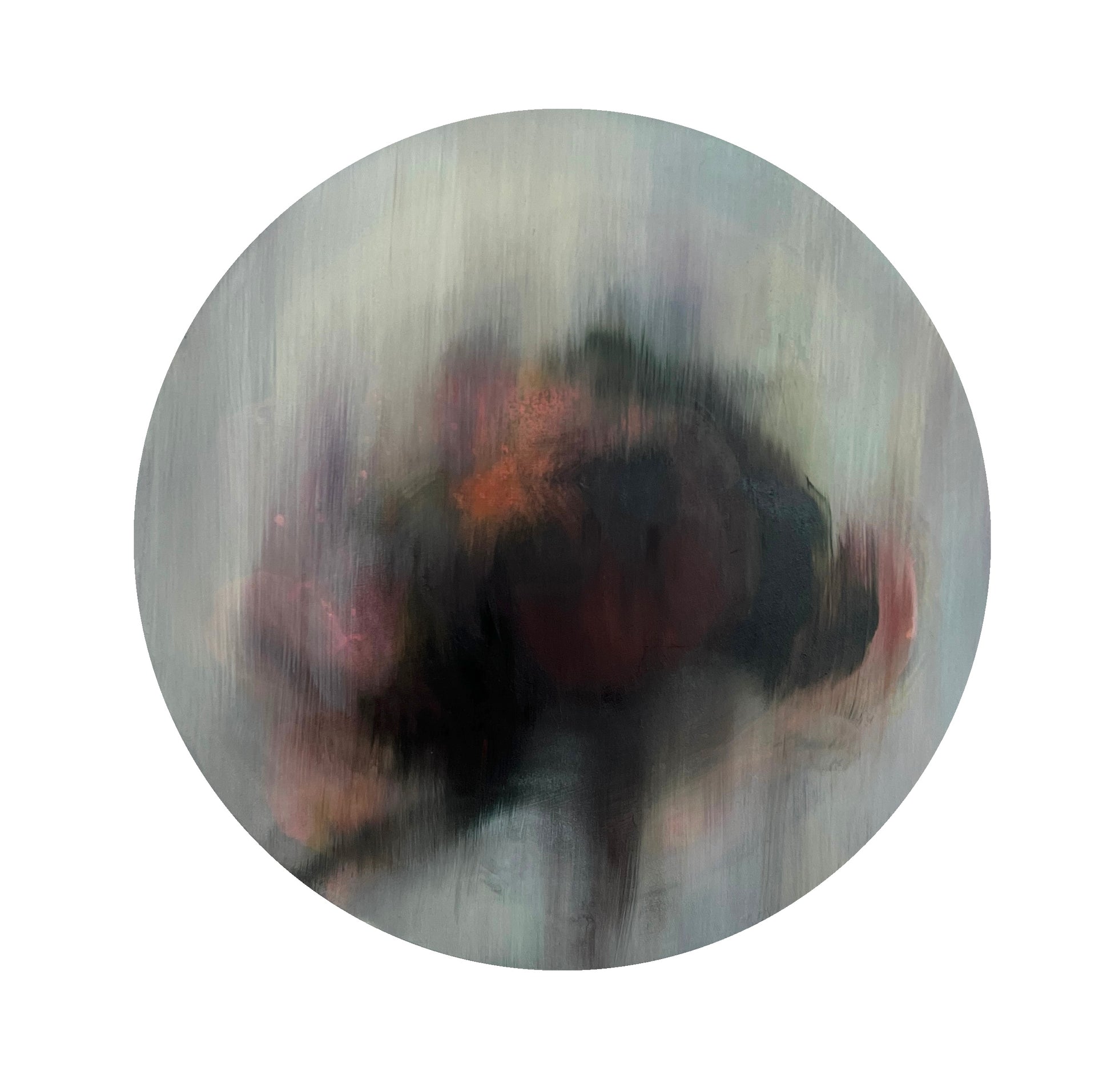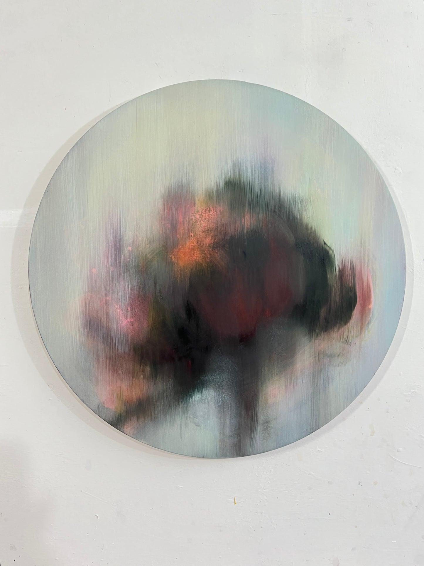 Painted slowly over a period of months, much time is spent layering the oils and mixed media onto silk