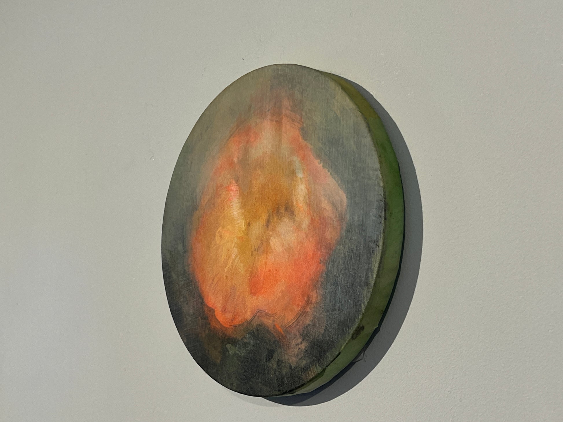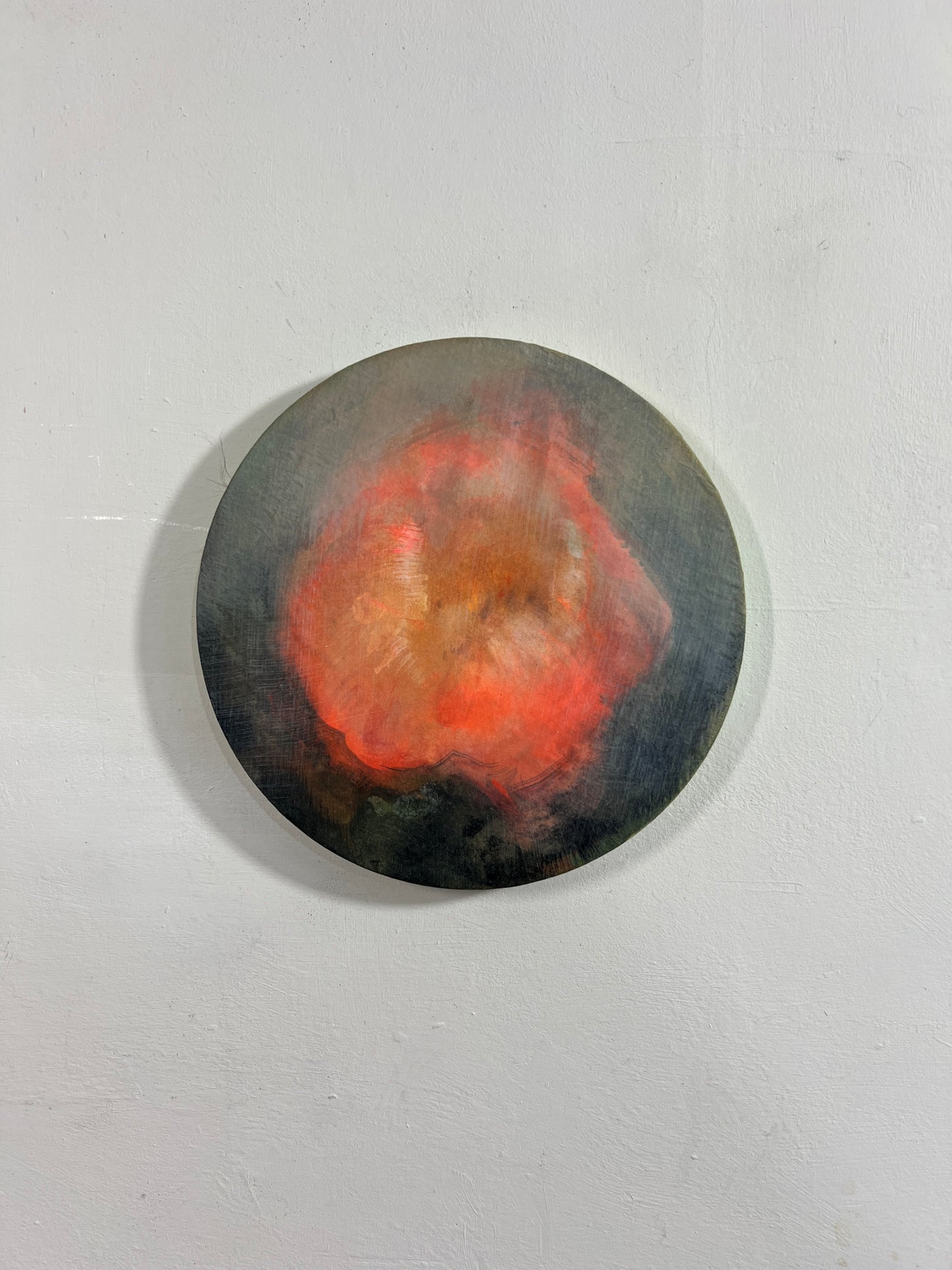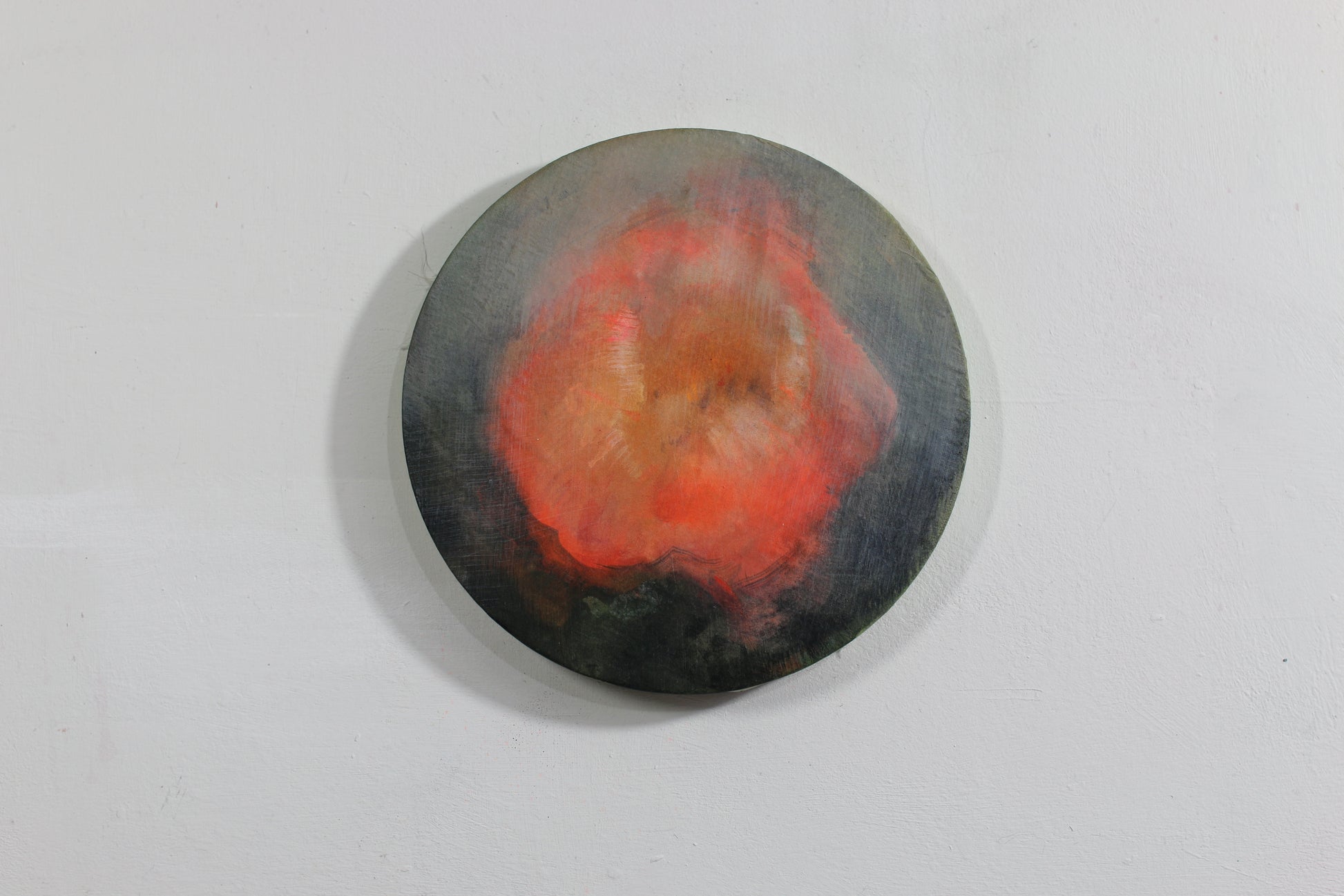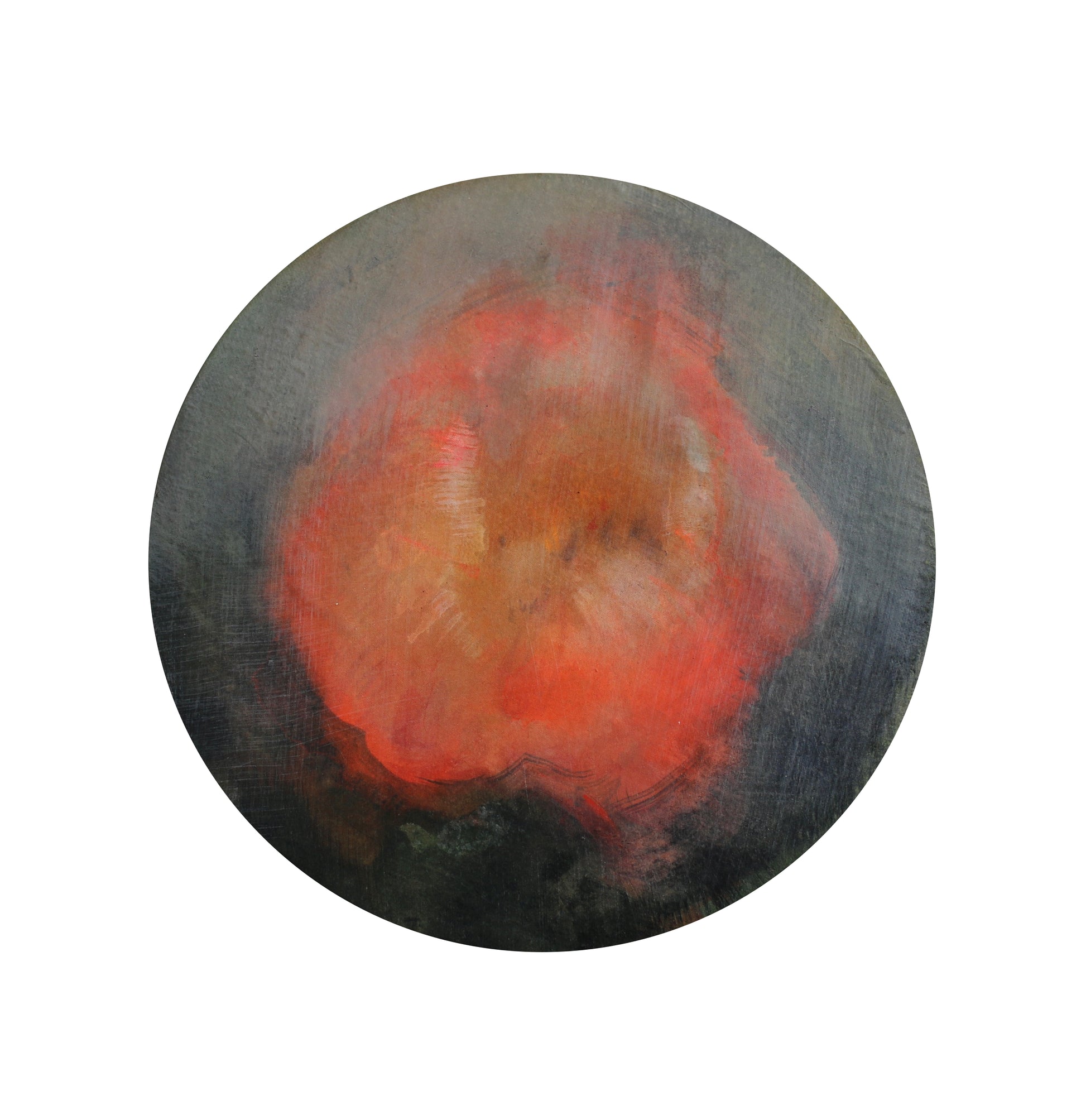 A vivid orange red bloom radiates from the centre of this delicate painting made slowly with layers of mixed media. Acrylic and oil on silk tondo unframed