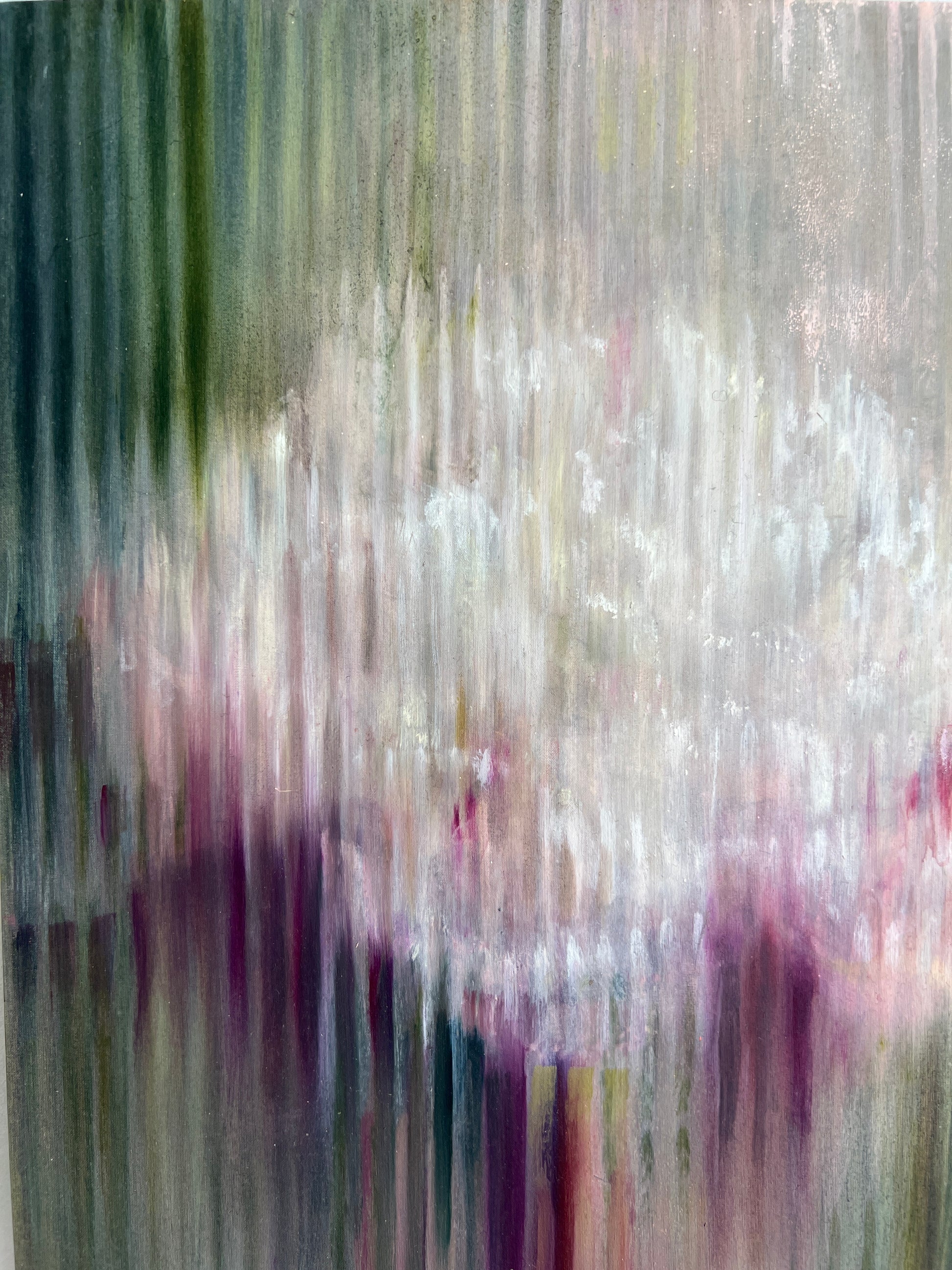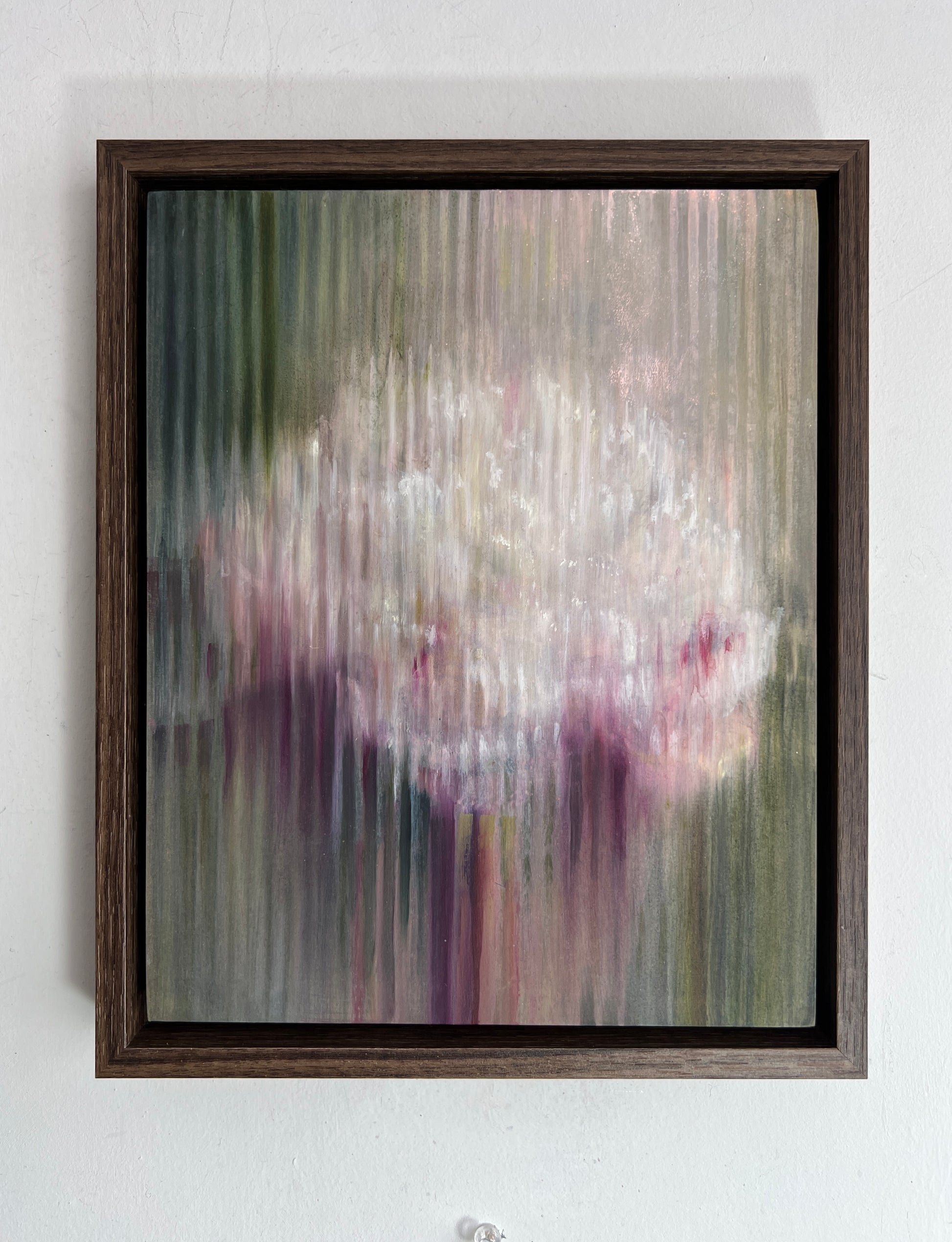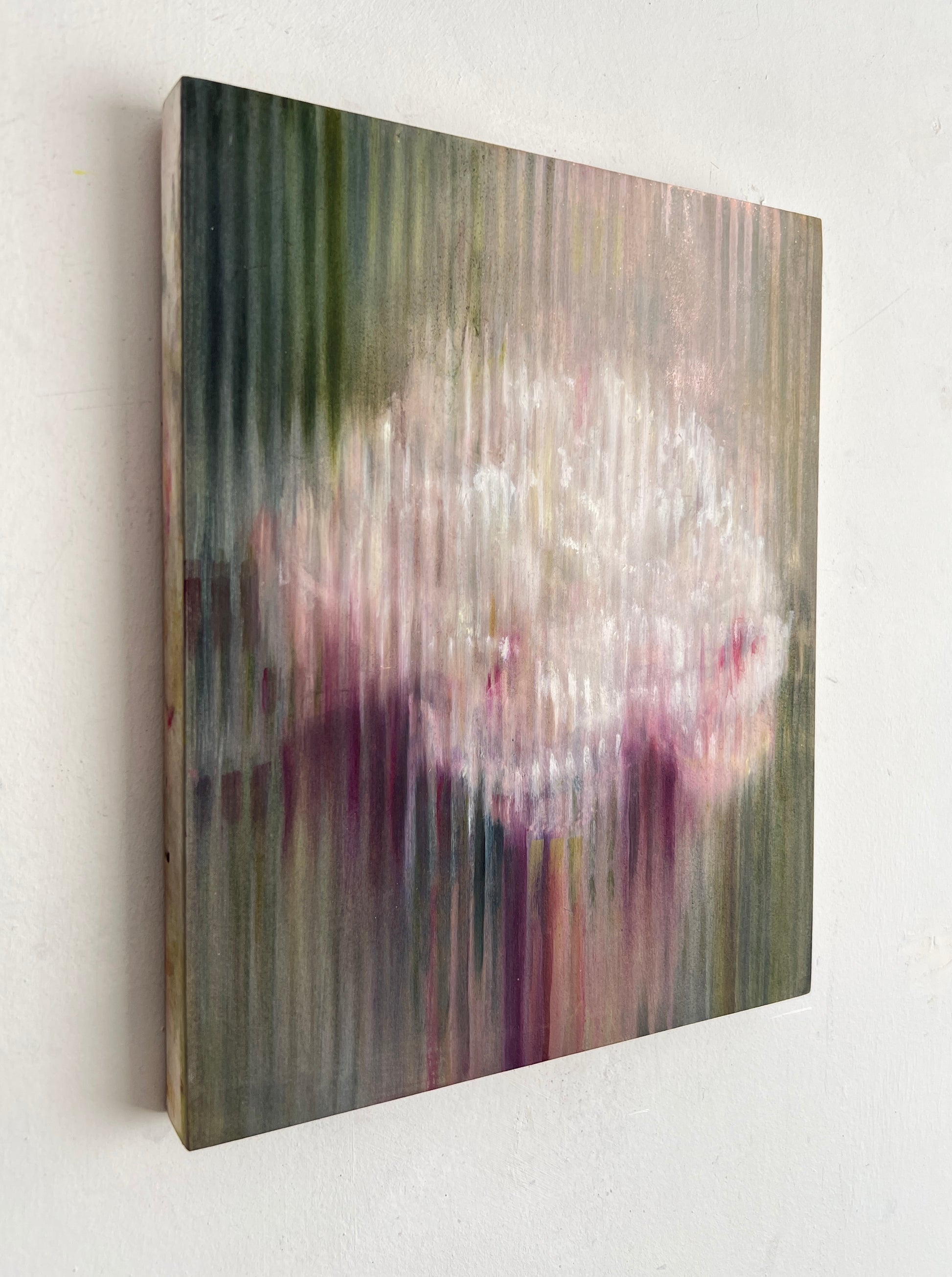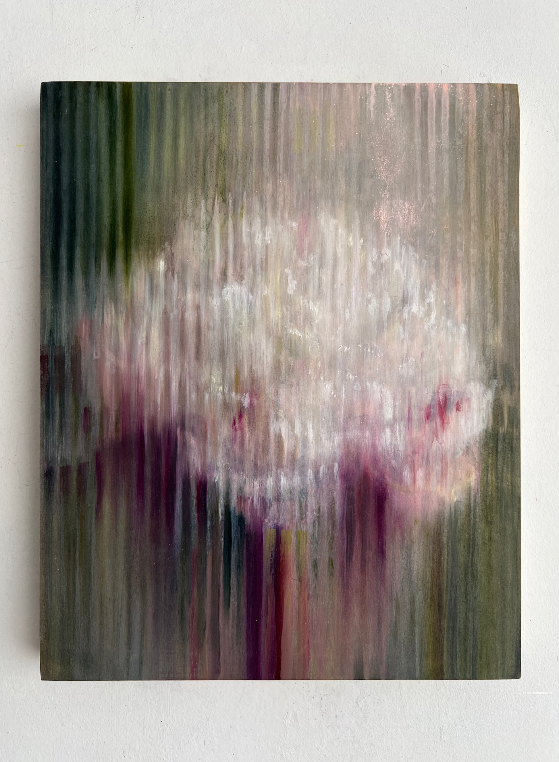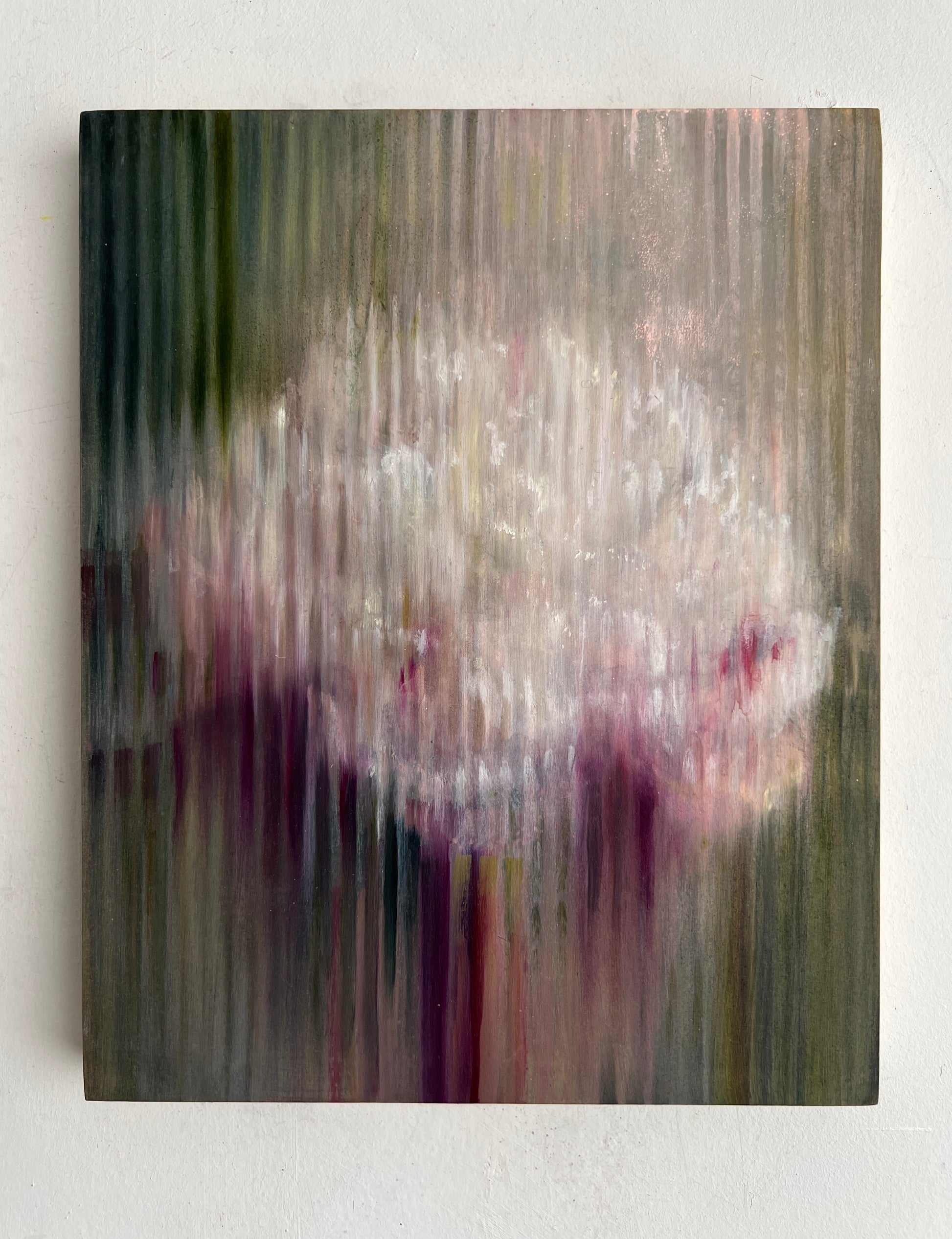 Nature morte, memento mori, a painting in acrylic ink, acrylic paint and oil paint on hand stretched Habotai silk over cradled panel of a Chrysanthemum in full bloom