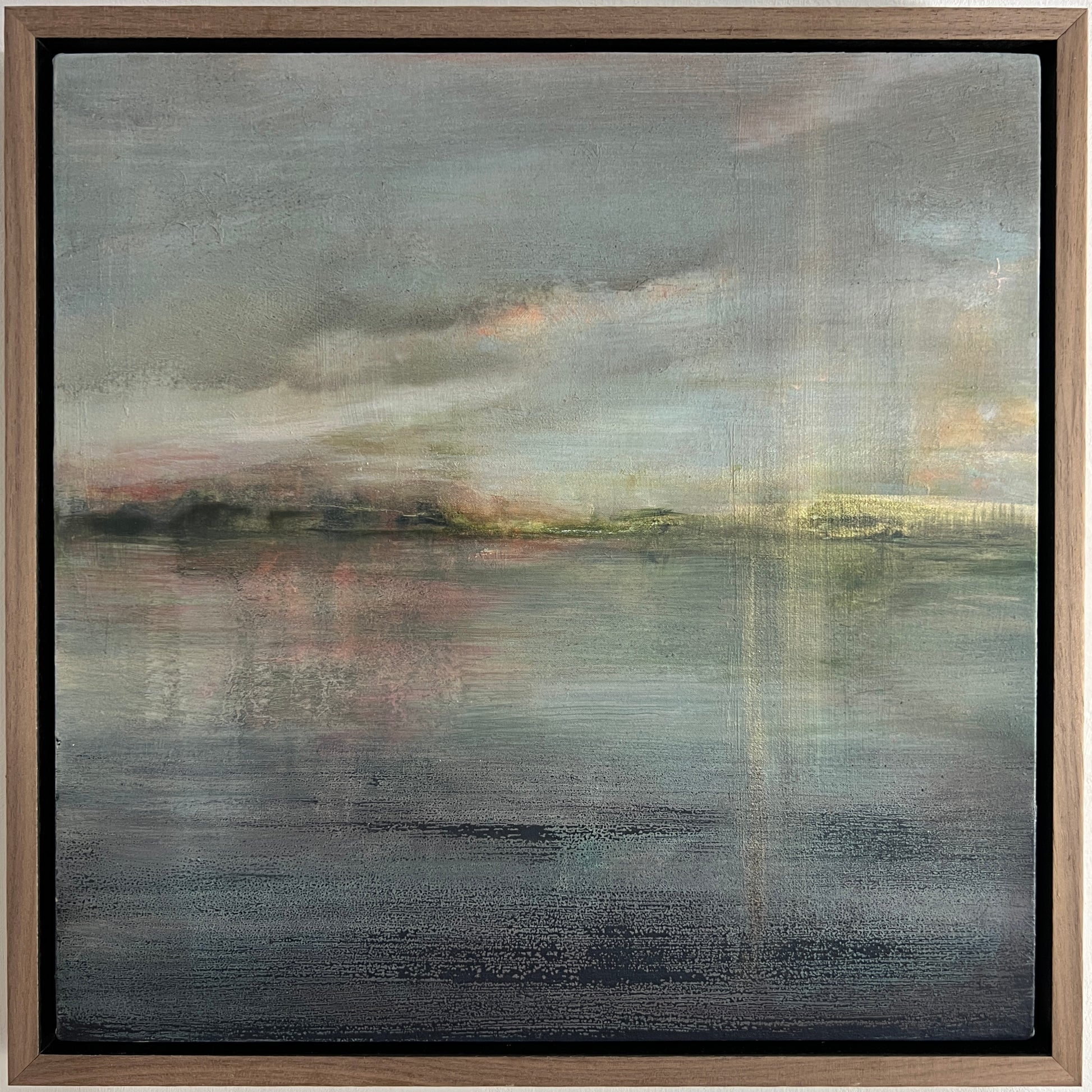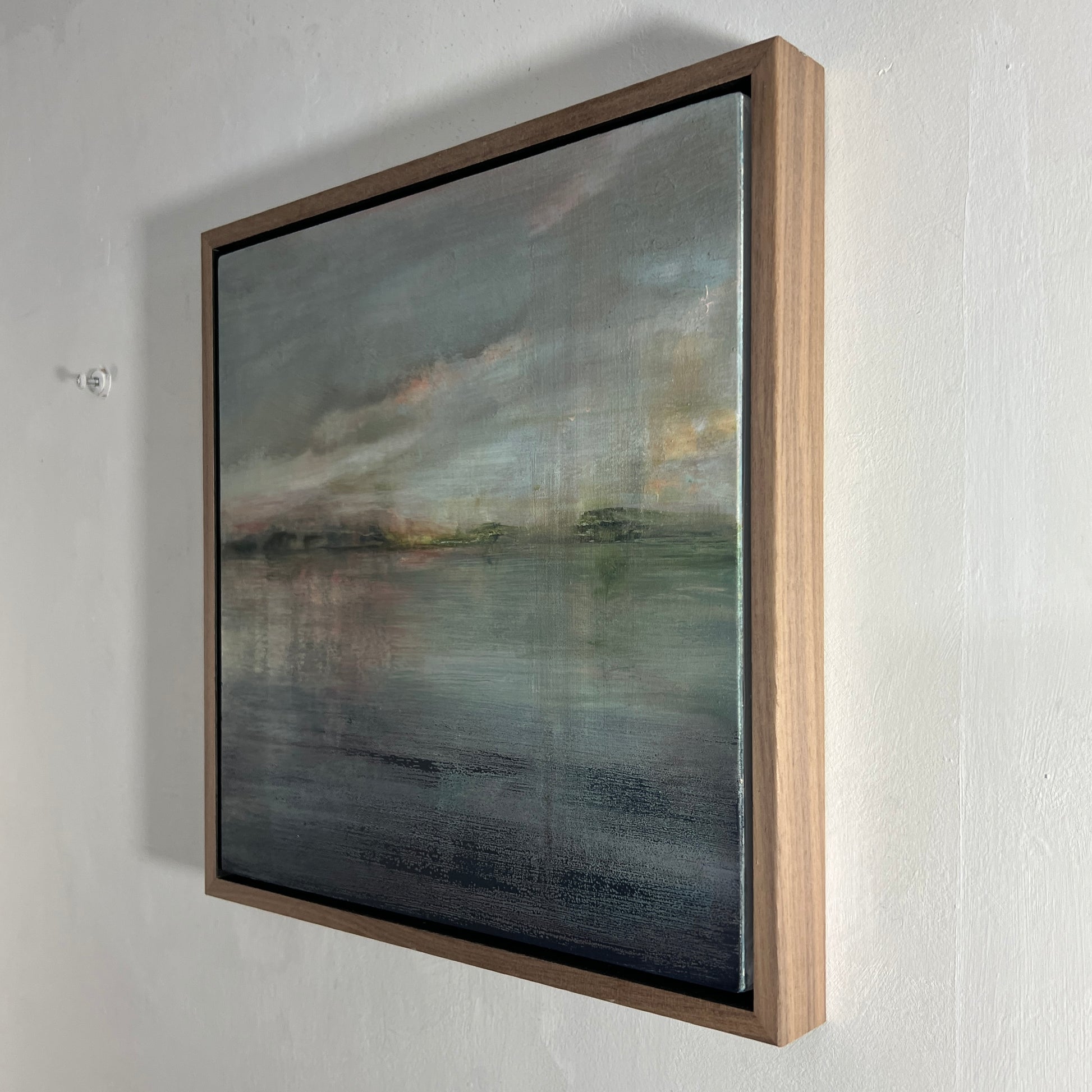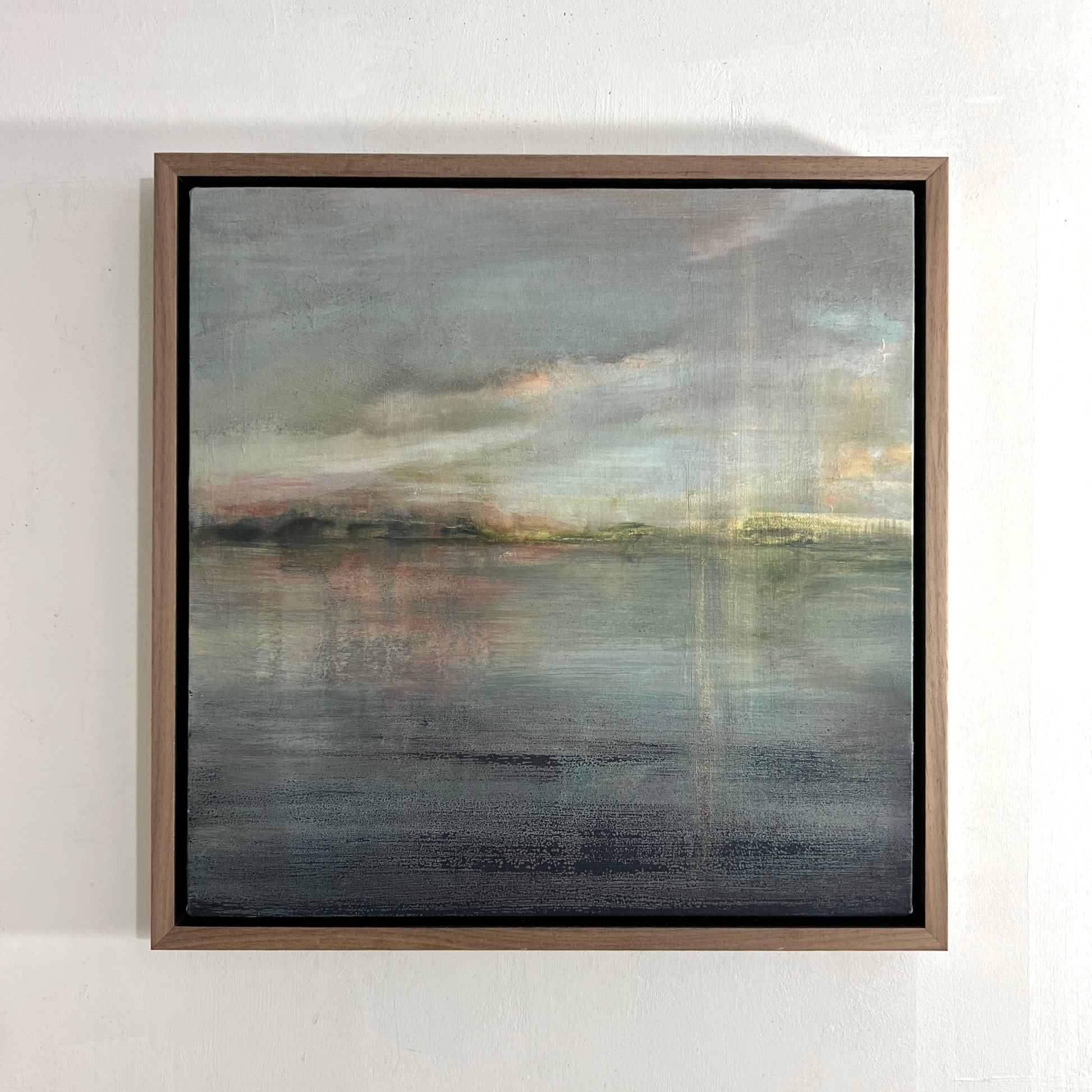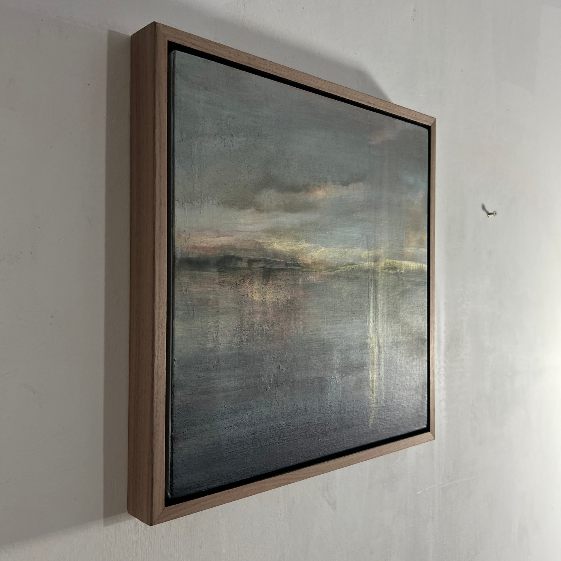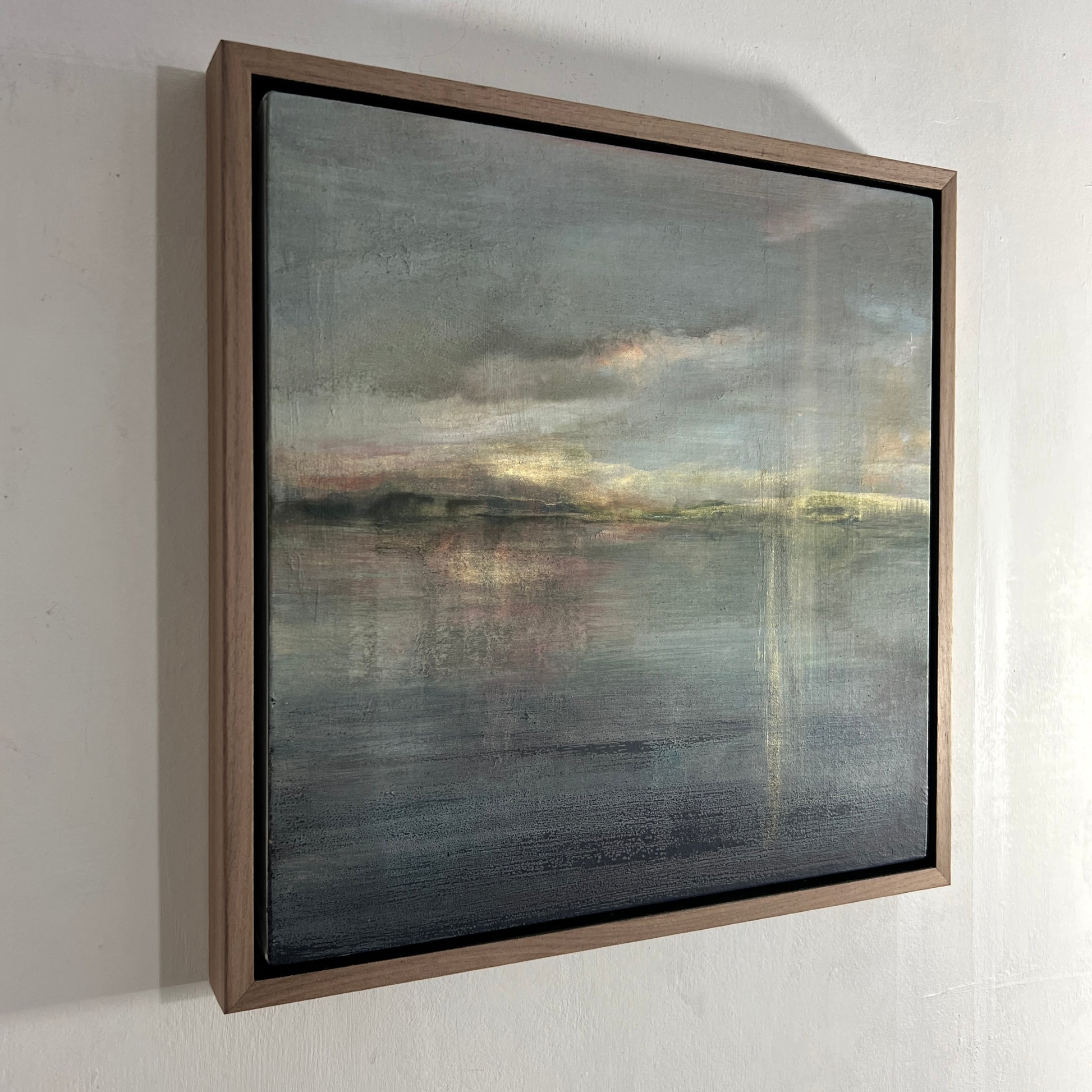 34 x 34 x 3cm, framed in a light oak tray frame with a dark stained recess