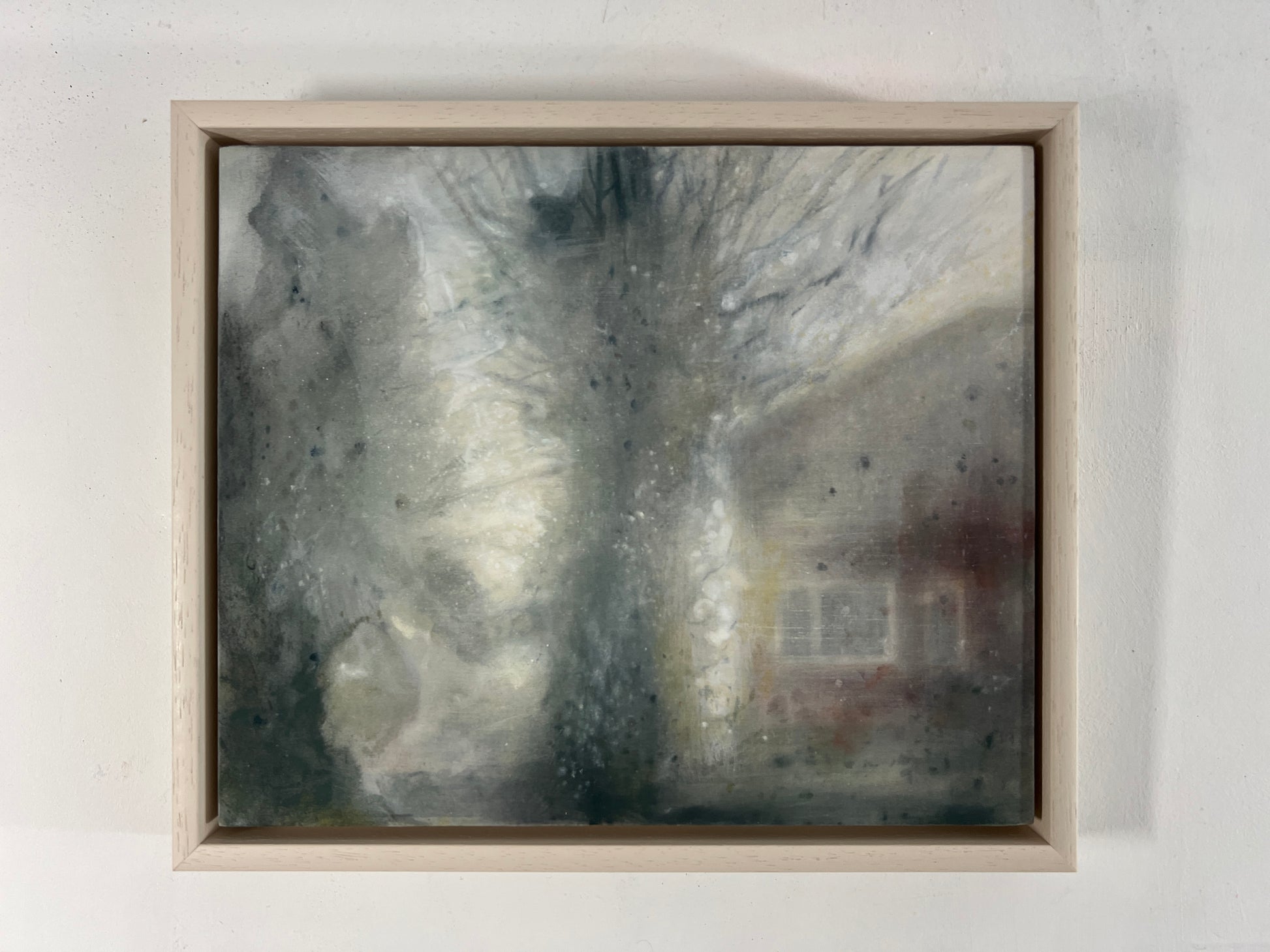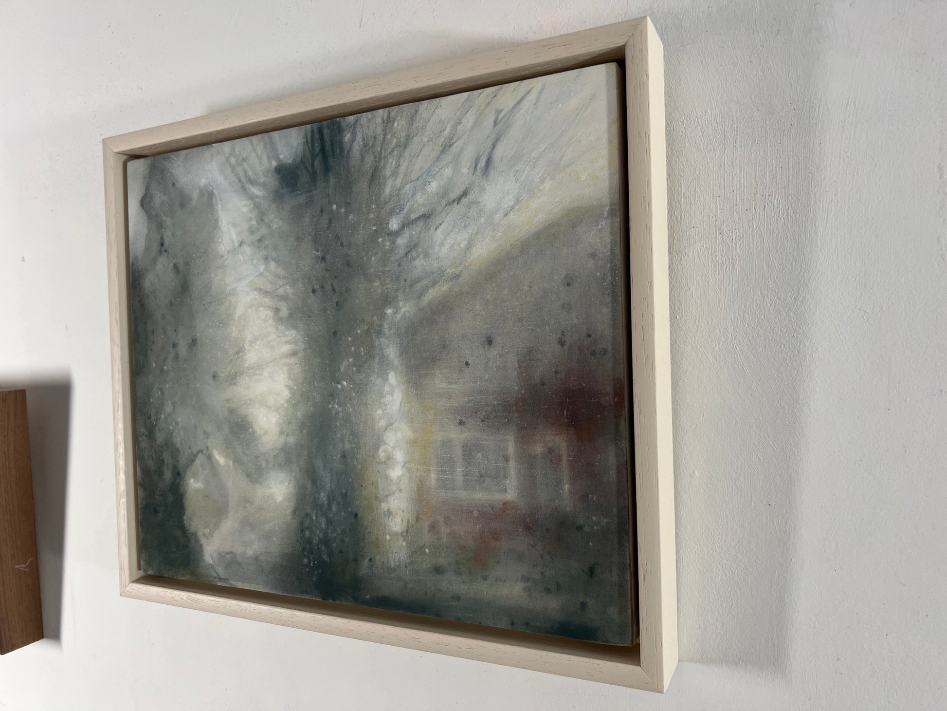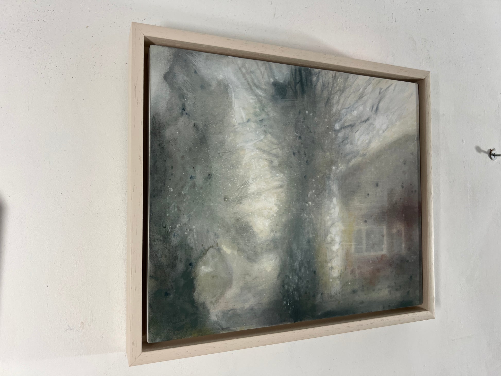 This is a unique painting of the view from the artists studio, viewed through a veil of morning frost, sunrise breaking through the morning haze